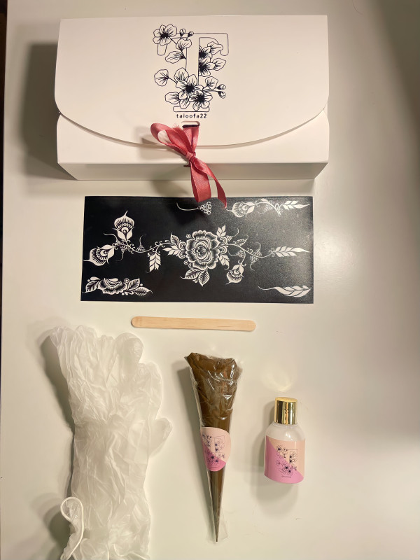 بوكس متكامل مع اي ستيكر من اختيارك يوجد به : عصا دهان الحنا +معصار حنا taioofa22+لوشن ترطيب +ستيكرات العدد2 من اختيارك +ارشادات تعليمية للحنا +قفاز